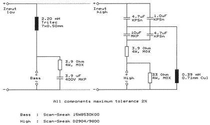 如果允許低音范圍的聲壓級低于100dB,則可使用一只口徑較小的低音單元。在這樣低的聲壓級下通常難以使低頻響應(yīng)下潛到50Hz以下,但本音箱使用的Scan-Speakl5cm低/中音單元在低頻下卻能產(chǎn)生足夠的聲輸出并能令人滿意地重放2kHz-3kHz的聲音,這樣就不必使用中音單元了。某些口徑較小的低音單元設(shè)計(jì)成能在較小的音箱中令人非常滿意的重放低音,本音箱使用的低/中音單元就是一個(gè)很好的例證。