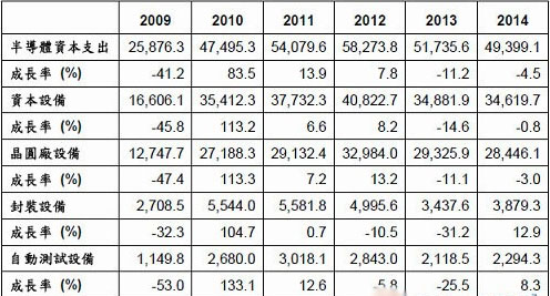 2009~2014年全球半導(dǎo)體資本設(shè)備支出預(yù)估(單位:百萬(wàn)美元)