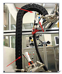 對(duì)于潔凈室環(huán)境來說,電纜拖鏈中的電纜集塵是一個(gè)復(fù)雜的問題。為了盡量減少集塵,需要盡可能地避免電纜以及套管之間的摩擦。盡管通過減少運(yùn)動(dòng)器件可以減少集塵,但是自動(dòng)生產(chǎn)線上電纜的運(yùn)動(dòng)不可避免。另外,用于分隔圓形電纜和套管的分隔片和支架是產(chǎn)生集塵的另一個(gè)因素。如果不使用分隔片,或者分隔片沒有正確的安裝,電纜以及套管之間的摩擦將導(dǎo)致這些部件的蠕變、移動(dòng)或扭曲,這樣就會(huì)增加集塵。