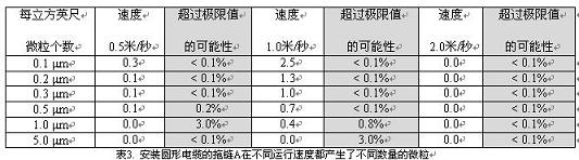 安裝圓形電纜的拖鏈A在不同運(yùn)行速度都產(chǎn)生了不同數(shù)量的微粒(見表3)。按照VDIGuideline2083和ISO14644-1標(biāo)準(zhǔn),鑒定這種電纜拖鏈/電纜裝置產(chǎn)生集塵的可能性是3%。