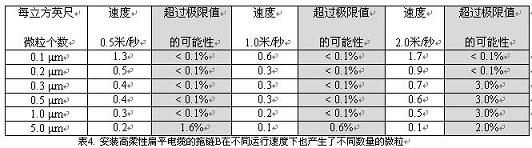 安裝高柔性扁平電纜的拖鏈B在不同運(yùn)行速度下也產(chǎn)生了不同數(shù)量的微粒(見表4)。按照VDIGuideline2083和ISO14644-1標(biāo)準(zhǔn),鑒定這種電纜拖鏈裝置產(chǎn)生集塵的可能性是3%。