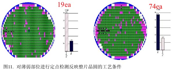 最終的實驗證明自動工藝檢測結果與最終良率的對應關系。表明自動工藝檢測可以反映存儲單元內接觸孔通孔刻蝕的狀態。對于在生產線上檢驗到薄弱部位有刻蝕不完全比較多的晶圓,其對應的正常存儲單元內也有較多的接觸孔有刻蝕不完全問題。可以通過對產品的薄弱部位進行監測達到對正常存儲單元內接觸孔刻蝕狀態的實時反映,這對接觸孔的刻蝕工藝改進有極大的促進作用(如圖11所示)。