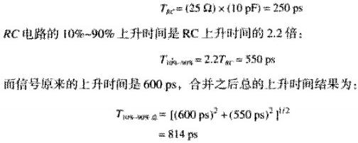 如第三個波形所示,當(dāng)連接的串聯(lián)電感很小時,探頭等效于一個簡單的電容負載。圖3.12所示的測試點等效信號源端阻抗為25歐,當(dāng)耦合到10PF的容性負載時,其RC上升時間是: