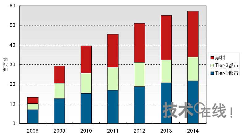 圖2:中國“一線城市”、“二線城市”及“農村”的液晶電視需求預測