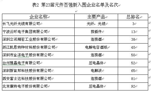 本屆元件百強中共有9家新企業,其中,我國光纖光纜制造業的龍頭企業長飛光纖光纜有限公司表現最為突出,一舉斬獲本屆元件百強的季軍寶座。而寧波云環電子集團有限公司、深圳立訊精密工業股份有限公司、浙江凱恩特種材料股份有限公司、深圳市金洋電子股份有限公司等新入圍企業均表現不俗。