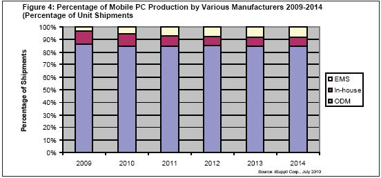 圖4所示為iSuppli公司對(duì)移動(dòng)PC產(chǎn)量份額的預(yù)測(cè),按制造商類型細(xì)分。