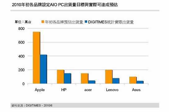 DIGITIMES Research預估2010年 AIO PC 市場將大幅成長,并進一步改寫品牌市占率生態,2009年原領先的日系品牌明顯下滑。蘋果(Apple)雖仍將居第一大品牌地位,但市占率也可見大幅滑落,預估從2009年的50%降至2010年的38%。