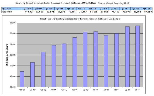 由于市場需求迅速的增長,2010全球半導體市場如注入強心劑一樣,促使iSuppli再次提升銷售額的預測至創記錄的水平。如下圖所示;