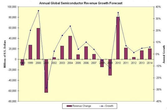 當2010年的增長與2000年相比時,要清楚此波周期的性質與2000年時有明顯的不同,這是十分重要的。2000年的增長是由于1999年的產能迅速擴充以及不能持久的網絡泡沫增長來推動,所以2001年泡沫破裂,導致半導體業下降28.6%。相比2010年的增長是由于受2009年的外力突然打擊,產業自身增長的動力暫時被壓抑,因而在2010年半導體產業能迅速回復,包括在2011年能繼續增長。