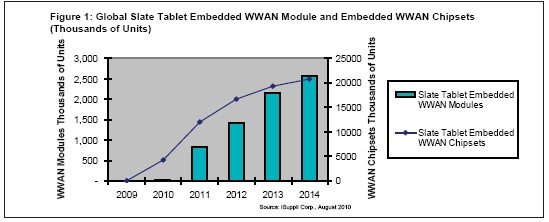 iSuppli公司預(yù)測,到2014年,slate型平板電腦市場的嵌入WWAN芯片組出貨量將達(dá)到2070萬個(gè),而2009年幾乎是零。同時(shí),到2014年slate市場的嵌入WWAN模塊出貨量將達(dá)到210萬個(gè),而2009年出貨量也幾乎是零,其間的復(fù)合年度增長率高達(dá)498.4%。所謂的slate型平板電腦,包括蘋果公司的iPad。