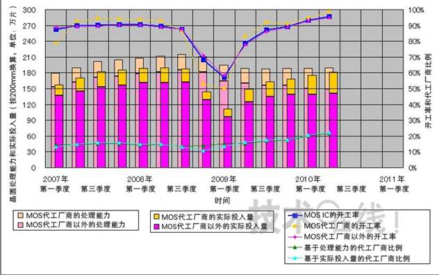 晶圓的實際投入量方面,除部分特例外,均持續了YoY增20~30%、QoQ增近10%的增長率。其中,從半導體廠商的企業形態來看,硅代工廠商的增長率比較顯著,而從工藝技術來看,60nm以下工藝的增長率較為顯著。硅代工廠商的投入量為YoY增67.8%,QoQ增10.6%,達到40萬2200 片/周(以200mm晶圓換算,下同)。60nm以下工藝晶圓的投入量為QoQ增13.0%,達到78萬500片/周。
