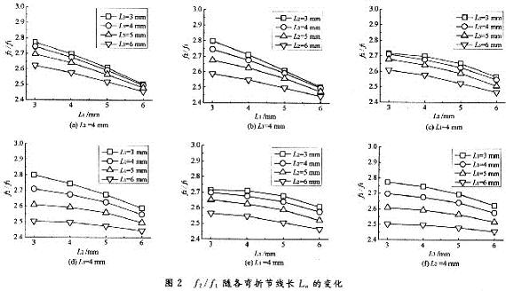 依次改變各彎折節(jié)的線長(zhǎng)Ln(n=1,2,3)和線寬Wn(n=1,2,3),計(jì)算出天線的第一諧振頻率f1和第二諧振頻率f2。通過(guò)比較f2/f1的變化來(lái)研究各彎折節(jié)幾何參數(shù)對(duì)天線諧振特性的調(diào)節(jié)作用。