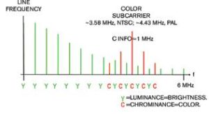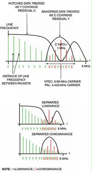 色度信息置于頻譜的高端,為線路長度的倍數。顯示方面的難題在于如何正確地提取亮度信息和色度信息,以及如何在未造成顯示偽像的情況下保持全帶寬。