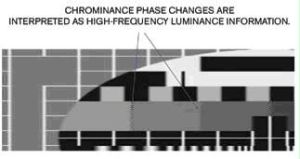 如果沒有發生亮度-色度分離,載波正循環或反循環時,顏色信息使畫面更亮或更暗。同時顏色信息也會錯誤地出現在圖像的黑白部分(圖2)。