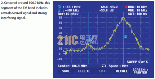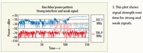 圖1顯示了這次在地圖上的測試行駛,其中3kW的發射機架在高大建筑物的樓頂。雖然天線在直接視線范圍內,但干擾源處于峰值水平,接收到的106.7MHz目標頻率信號質量下降嚴重。圖2顯示了信號強度的典型頻譜,圖3顯示了測試行駛期間2個信號的強度。