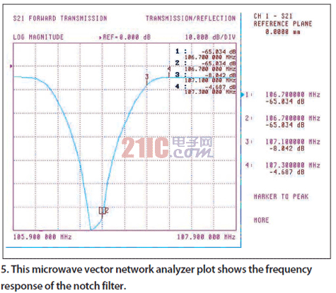 圖5:微波矢量網絡分析儀測量到的陷波濾波器的頻率響應。