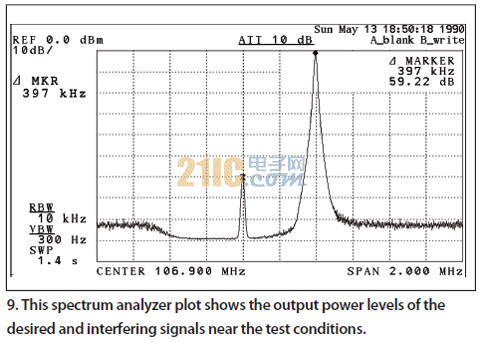 在不同的發生器1頻率設置點觀察到以下現象:如果測試裝置有限制因素,那么音頻的信噪比(SNR)不會隨著干擾射頻信號的遠離而變化。如表所示,接收機的去靈敏作用是由強大的干擾源引起的,從而證明來自測試裝置的噪聲不是106.7MHz測試頻率點的限制因素。