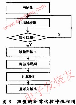 雷達工作時,單片機控制窄帶濾波器不斷的進行掃描,當某一個濾波器有信號時,由可重觸發單穩態電路組成的信號檢測電路輸出由“0”變為“1”,單片機根據輸出的窄帶濾波器獲得帶內頻率,判斷出精度不太高的距離范圍,利用放大整形輸出進行計數或測量脈沖的周期,獲得足夠精確的頻率值,即為準確距離。根據公式計算出R和V送顯示器予以顯示,或通過RS232串口送上一級的計算機系統。