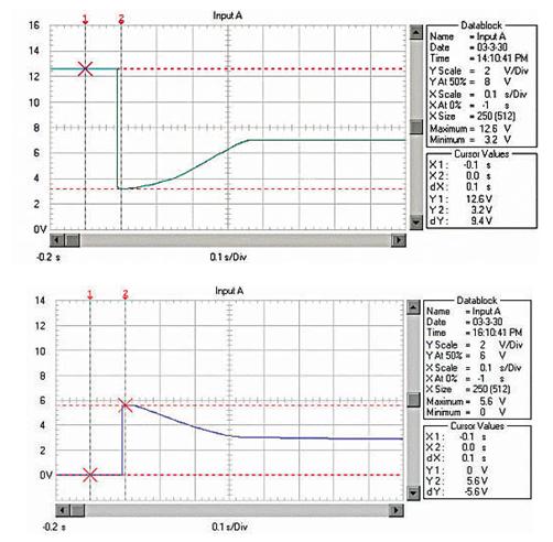 由于RM、RB、RL均非常低,啟動電流非常大。例如用12V、45Ah的蓄電池啟動安裝1.9升柴油機(jī)的汽車,蓄電池的電壓在啟動瞬間由12.6V降到約3.6V!啟動過程的蓄電池電壓波形如圖1;啟動瞬時(shí)的電流達(dá)550A,約為蓄電池的12C的放電率!啟動過程的蓄電池電流波形如圖2,(電流傳感器的電流/電壓變換比率:100A/V)。盡管車用蓄電池是啟動專用蓄電池,可以高倍率放電,但在圖1中可以看出,10倍以上的高倍率放電時(shí)的蓄電池性能變得很差,而且,如此高倍率放電對蓄電池的損傷也是非常明顯的。啟動過程的電壓劇烈變化也是極強(qiáng)的電磁干擾,可以造成電氣設(shè)備的“掉電”,迫使電氣設(shè)備在發(fā)電機(jī)啟動過程結(jié)束后重新上電,計(jì)算機(jī)在這個(gè)過程中非常容易死機(jī)。因此,無論從改善汽車電氣設(shè)備的電磁環(huán)境還是改善汽車的啟動性能和蓄電池的性能、延長使用壽命來考慮,改善汽車電源在啟動過程的性能是必要的。