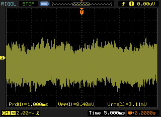 圖4是用DM3068的數據繪圖功能重新測試該電源電壓得到的電源波形,圖形左側是歷史數據的波形,圖形右側是實時波形。從實時波形中可以清楚地看到幅度約為4.4mVpp的正弦紋波,進一步推算可以得出正弦波頻率約為50Hz。能量如此強的50Hz信號會給精密電路帶來很大的干擾。