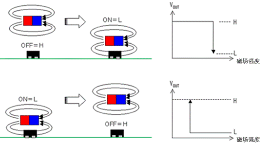 AS系列能夠通過(guò)磁鐵和傳感器之間的距離改變來(lái)檢測(cè)出磁通密度的變化,控制傳感器輸出信號(hào)的開(kāi)關(guān)(高(H)<=>低(L)),如圖5所示。當(dāng)磁鐵接近傳感器,使磁場(chǎng)的強(qiáng)度變大,則傳感器的輸出就會(huì)由“高”變“低”,反之則由“低”變“高”。