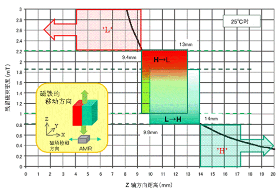 在電氣設(shè)計(jì)上,需要考慮傳感器的特性,使用的磁鐵特性,以及和傳感器的位置關(guān)系。圖7是模擬將鐵氧體磁鐵(5×4×6mm)沿Z軸(遠(yuǎn)離傳感器)方向移動(dòng)時(shí)的情況。從傳感器的磁滯開(kāi)始,9.4mm以下輸出信號(hào)一定是“低”(靠近磁鐵,蓋閉合);14mm以上輸出信號(hào)一定為“高”(遠(yuǎn)離磁鐵,蓋打開(kāi))。實(shí)際設(shè)計(jì)的時(shí)候,還需要考慮到傳感器特性的偏差、溫度特性,磁鐵的溫度特性,生產(chǎn)時(shí)以及時(shí)間長(zhǎng)了之后傳感器的位置偏移。