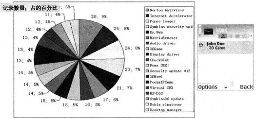 當(dāng)用戶打開含有CommWarrior病毒的MMS消息后,該病毒將在手機(jī)中進(jìn)行安裝,并開始向手機(jī)號(hào)碼薄中的用戶隨機(jī)發(fā)送含有自身拷貝的MMS消息。同時(shí),CommWarrior會(huì)偽造彩信主題進(jìn)行傳播,通常包含著這樣的內(nèi)容“來(lái)自我的3D游戲!免費(fèi)!”以及“適合所有型號(hào)諾基亞手機(jī)的鈴聲”等,使得接受彩信的用戶不會(huì)引起警覺,具體各類的消息內(nèi)容的比例如圖2所示。