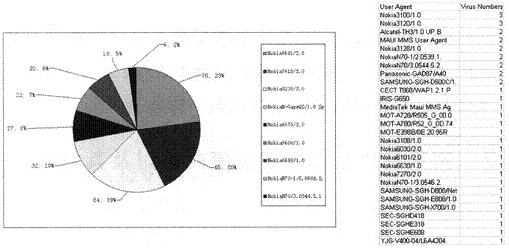 通過(guò)GPRS核心網(wǎng)抓包分析,目前用戶感染的彩信病毒類型主要是CommWarrior病毒,A,B,C分別是其的變種類型,具體感染的比例參見圖3。
