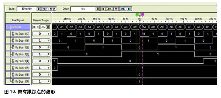 設置定時分析儀的跟蹤特性與設置示波器的觸發電平和斜率稍有一點區別。許多分析儀是在跨多條輸入線的高和低碼型上觸發。注意圖6中的菜單。我們已告訴分析儀當“INT4”的通道0, 2 , 4 , 6為高(邏輯1),1 , 3 , 5 , 7 通道為低(邏輯0)時開始捕獲數據。圖7顯示得到的結果,中間的垂直線示出了跟蹤點。在跟蹤點,通道0 , 2 , 4 , 6均為高,而通道1 , 3, 5, 7 均為低。為使某些用戶更感方便,絕大多數分析儀的觸發點不僅可用二進制(1 和0),而且可用十六進制,八進制,ASCII或十進制設置。例如在前面的例子若采用十六進制設置,觸發特性即可用55代替0101 0101。在查看4, 8, 16, 24, 32 bit 寬的總線時,使用十六進制的觸發點會更加方便。想想如果用二進制設置24 bit