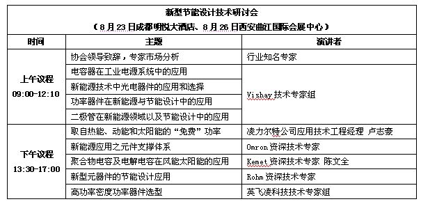 新型節能設計技術研討會以風能太陽能發電與節能設計為主題,圍繞智能電源、逆變器設計、智能控制、馬達控制、新型電子元器件與模塊的應用展開探討,來自知名廠商的技術專家將分享逆變器設計、馬達控制、變頻技術、電力電子技術在風能/太陽能、工業電子、通信設備、軍工上的應用解決方案和節能設計技術。