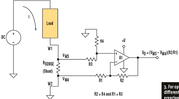 為避免引入這樣的誤差,需要進一步增加兩個措施:采用開爾文連接方式與分流電阻相連并加入一個差分輸入放大器。開爾文連接是一種帶有兩條激勵引線和兩條傳感引線的4線連接(圖2)。其中兩條線(W1和W2)是激勵引線,它們將分流電阻連接到該電路的大電流端。另外兩條線(W3和W4)為傳感引線,它們將分流電阻兩端的電壓連接到放大器。這個方式將攜帶負載電流的導線與測量電路分離開來,并把W1和W2中的電壓降從分流電阻兩端的電壓測量中清除。為了進一步有效利用開爾文連接的優點,還需加入一個差分放大器(如圖3)。