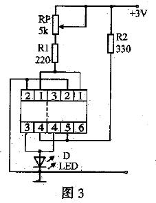 光電耦合器檢測電路如圖3所示,可將TLP621等四個引腳的光電耦合器插入插座左端的四個引腳的插孔中,將TLP332等六個引腳的光電耦合器插入插座右端的六個引腳的插孔中。接通電源后,電源經RP、R1給IC中的發光二極管提供一個正向電壓,發光二極管發光,使IC中的光電三極管導通,3腳外接的發光二極管D發光,若調節RP時,發光二極管的亮度能跟著變化,則被測光電耦合器是好的。