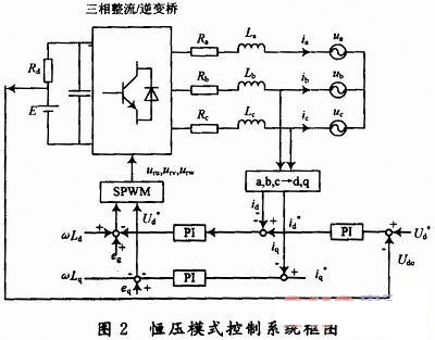 在對機(jī)車蓄電池充電時(shí),為了快速充電同時(shí)延長電池的使用壽命,將充電與放電過程分成不同的階段,可以視具體情況分階段選擇恒流或者恒壓模式充放電。恒壓充放電模式采用電壓定向控制模式,控制框圖如圖2所示。控制策略采用雙閉環(huán)結(jié)構(gòu),外環(huán)控制直流電壓,內(nèi)環(huán)控制電流。電流內(nèi)環(huán)作用是提高系統(tǒng)的動態(tài)性能和實(shí)現(xiàn)限流保護(hù),電壓外環(huán)的作用是保證直流側(cè)電壓的穩(wěn)定性。直流輸出電壓給定信號和實(shí)際直流電壓Vdc比較后的誤差信號送入P1調(diào)節(jié)器,PI調(diào)節(jié)器的輸出即為主電路交流輸入?yún)⒖茧娏鞯姆担容^得到電流誤差后,對電流誤差進(jìn)行PI調(diào)節(jié),用以減緩電流在動態(tài)過程中的突變。然后再與輸入電壓的空間矢量進(jìn)行比較控制,最后通過SPWM調(diào)制算法即可生成相應(yīng)6路驅(qū)動脈沖控制三相整流橋IGBT的通斷,間接地控制網(wǎng)側(cè)電流,實(shí)現(xiàn)網(wǎng)側(cè)功率因素的調(diào)節(jié)。