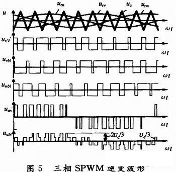 本文采用SPWM調(diào)制方式。圖2中,三相調(diào)制信號uru、urv和urw為相位依次相差120°的正弦波。a,b,c相自關(guān)斷開關(guān)器件的控制方法相同,現(xiàn)以a相為例:在uru>uc的各區(qū)間,給上橋臂電力晶體管V1以導(dǎo)通驅(qū)動信號,而給下橋臂V4以關(guān)斷信號。在uru<uc的各區(qū)間,給V1以關(guān)斷信號,V4以導(dǎo)通信號。圖5是三相橋式PWM逆變電路輸出三相對于負(fù)載中性點(diǎn)N的相電壓波形。