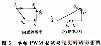 圖6是a相在整流運(yùn)行、逆變運(yùn)行時(shí)的相量圖。在SPWM調(diào)制方式下,電網(wǎng)電壓ua與ua產(chǎn)生的基波分量uao為正弦波,流過電感La的電流也為正弦波。圖6所示,從a相電路的相量圖可以很容易地看出,三相電壓源型PWM雙向變流器可以實(shí)現(xiàn)單位功率因數(shù)運(yùn)行。