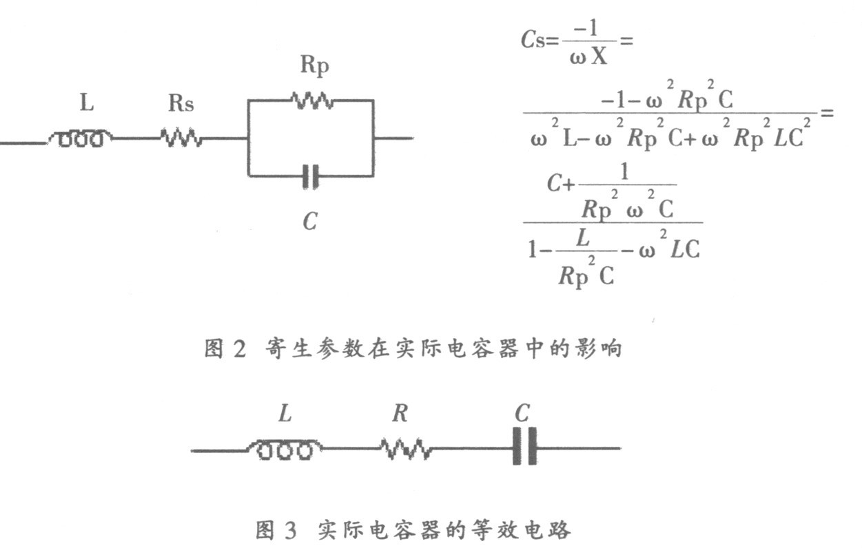 當我們進行電容器測量時, 必須考慮這些寄生量。阻抗測量儀器使用串聯模式(Cs-D、Cs-Rs)或并聯模式(Cp-D、Cp-Rp) 來測量電容。由于寄生參數的存在, 造成所顯示的電容值并不總是等于實際電容值C。例如, 當使用Cs-Rs 模式測量圖1 所示的電容器電路時, 顯示的電容值用圖2的復雜公式表示。只有當Rp 值足夠高, 并且L 的電抗可以忽略時, Cs 才等于Co。在高頻區能看到L 的影響, 在這種情況下就不能忽略L。對于高值電容器, 與C 值并聯的電抗遠低于Rp。對于低值電容器, Rp 本身就很高, 所以, 大多數電容可用圖3 表示。