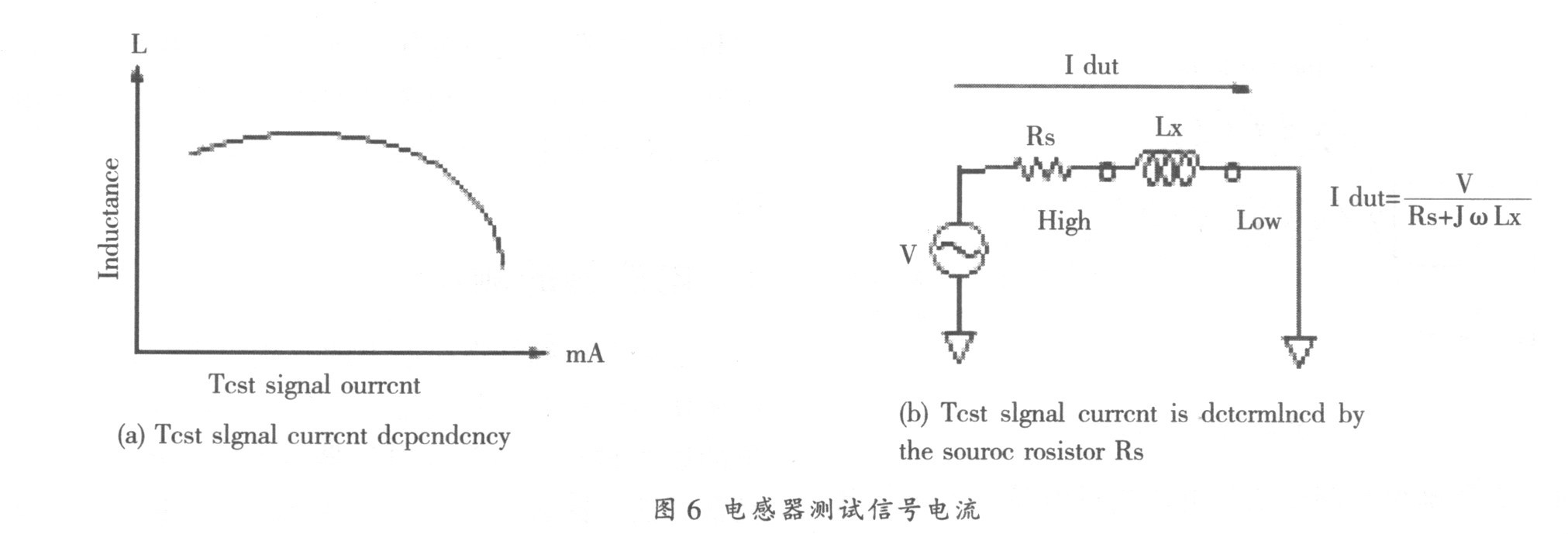 磁性電感器與測試信號電流的關系如圖6 (a)所示。電感量隨測量電流的大小而不同, 即使將兩臺不同的儀器設置為同樣的輸出電壓, 如果它們的源阻抗不同, 它們的輸出電流也將不同, 請參考圖6 (b)。有些磁性電感器的電感量與流過電流的關系很大, 電流的變化可導致電感值成倍地變化。我們多次遇到元件制造廠與元件使用廠家的糾紛就源于此。他們用不同的儀器測量同一產品的結果有很大的不同, 進而懷疑儀器有問題, 但儀器經過我們計量校準是合格的。其實就是因為儀器的源阻抗不同而導致通過測試件的電流不同, 測量結果當然也就不一致。因此一些高檔的LCR 表有電壓、電流監視器功能, 可監測實際加在測試件上的電壓及流過測試件的電流。