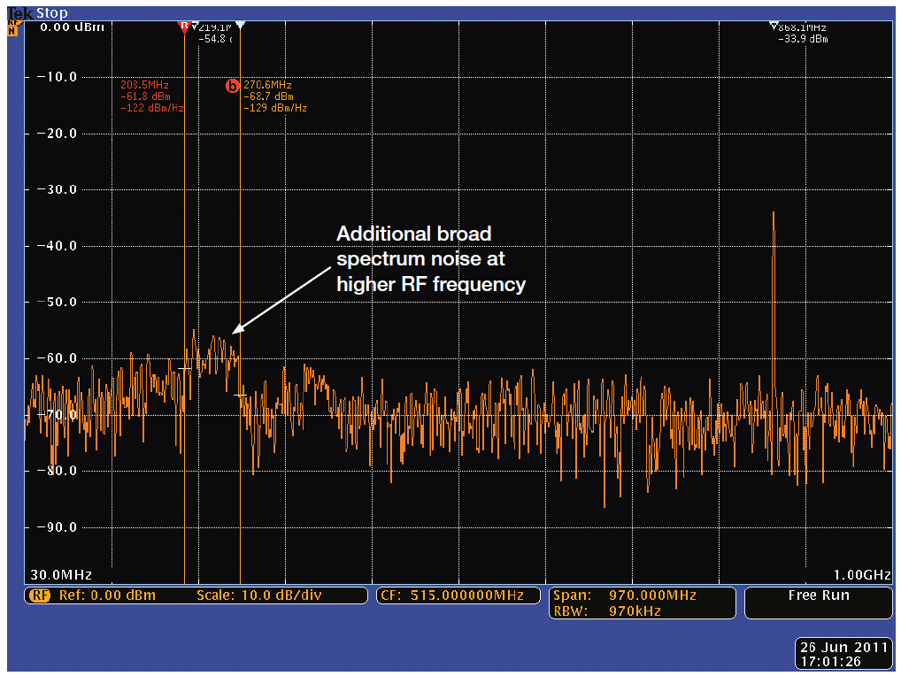 在電源驅動RF電路板時,噪聲功率的時域畫面和頻域畫面變化。圖6顯示了相同的電源噪聲及額外的信號。注意二階諧波下降,但有許多其它低電平噪聲。部分噪聲可能會給無線電接收機的運行帶來很大干擾,需要認真評估。