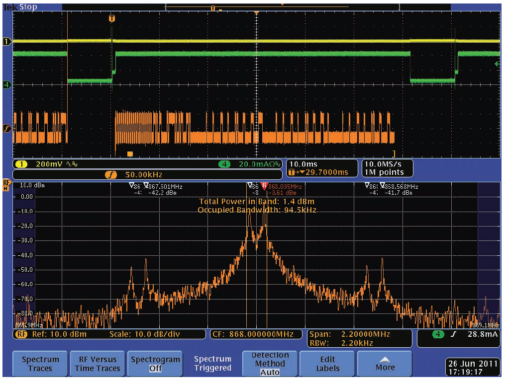 我們測量以868 MHz為中心的無線電頻譜,其擁有相當?shù)偷? kbps的FSK調(diào)制數(shù)據(jù)速率,以供參考。圖2顯示了參考頻譜。注意MDO同時顯示時域視圖和頻域視圖,所有信號都時間相關。[page]