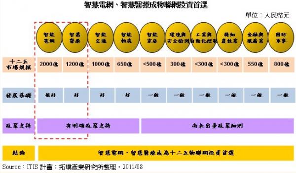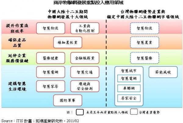 歐美經(jīng)濟體危機四伏,中國大陸市場需求反而撐起全球經(jīng)濟半邊天。不可諱言,面對全球不景氣環(huán)境,未來兩岸合作將是臺灣經(jīng)濟得以維持成長的主要動能之一。根據(jù)拓墣產業(yè)研究所ITIS計劃顯示,目前全球皆密切關注的“中國大陸十二五規(guī)劃”中,對于通訊基礎建設和IC產業(yè)的高度重視,連帶也為“物聯(lián)網(wǎng)”產業(yè)的快速發(fā)展埋下伏筆。