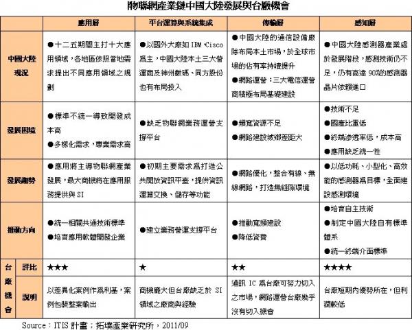 感知層一直以來都是臺廠之強項,加上中國大陸目前技術較為薄弱,短期臺灣感測芯片廠具有較大之優(yōu)勢。應用部分,智能電網(wǎng)與智能醫(yī)療在中國大陸將是最大的應用領域與投資方向。但由于物聯(lián)網(wǎng)應用范圍廣大,涉及各個層面,資源難以集中發(fā)展,臺廠可藉由差異化案例作為利基,將解決方案包裝后整案輸出。例如,臺灣目前推動的智能生活計畫,所積累的物聯(lián)網(wǎng)發(fā)展經(jīng)驗及成熟技術,如智能農業(yè)、智能醫(yī)療、智能電表等,都是臺廠可藉力使力、搶攻物聯(lián)網(wǎng)應用市場的機會。