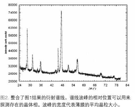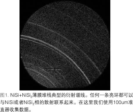 相分析要求事先了解感興趣的相。一種自動化的峰擬合算法用來獲得曲線中每一個峰的位置和強度值。將實驗峰值的位置與感興趣相的譜線作對比,來確定該相是否存在。另外,曲線中不能被匹配的峰意味著更多的相存在。例如在圖2中,如果取樣程式認為在測量的硅片上只存在鎳單硅化物,盡管事實上相的鑒定需要手工完成,但多余的峰(來自于NiSi2)仍然會被軟件標記。為了測量不同相的比例,一種針對多相系統的應用遵循了這樣的原理,即一個獨立相衍射峰的強度(一級近似)與薄膜中對應相的數量成比例。