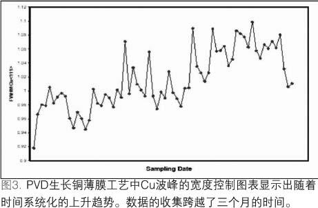 這種設備最初的一種應用是監測一系列物理氣相淀積(PVD)的反應腔,這些反應腔在銅互連金屬化制程中被用來淀積TaN/Ta/Cu襯墊層和籽晶層。這種監測作為標準的平面電阻,膜厚量測的補充而存在。薄膜堆棧中Ta和Cu成分的織構強度和譜線展寬數據都需要收集。TaN層具有無定形結構,因此無法監測。圖3說明了一個從銅元素峰寬控制圖表中輸出的例子。數據的趨勢穩步向上,表明PVD銅籽晶的平均晶粒大小隨著時間在減小。圖4說明了在相應的Rs圖表中類似但并不十分顯著的增加。隨后的設備診斷發現受影響的反應腔一個閥門有空氣泄漏的現象。泄漏影響到濺射工藝,進而影響銅籽晶層的淀積,這一過程極有可能是在淀積和淀積之后的自退火過程中,由于銅在Ta表面的遷移率下降造成。更換了閥門之后,Rs和銅元素峰寬的值都變小,我們從圖3和圖4控制圖表中的最后三個數據點可以看出。