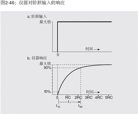 模擬儀器(或模擬輸出)的上升時間一般定義為輸入信號從零立即上升到某一固定值時,輸出信號從最終值的10%上升到90%所需要的時間。此關系示于圖2-46。圖2-46a示出假定上升時間為零的階躍函數,而圖2-46b示出儀器的響應及相應的上升時間。單極點系統(1階系統)的上升時間、頻率響應和RC常數是有關聯的。3dB點由下式給出: