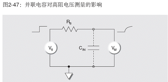 在對高阻抗源進行電壓測量時(圖2-47),電壓表(VM)兩端的電容(CIN)必須通過RS充電。輸出電壓對時間的函數關系為: