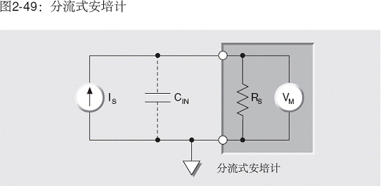 使用分流型安培計(圖2-49)時,輸入電容對電流測量的影響與電壓測量時類似。分流型安培計可以看成是在其輸入端跨接了電阻器的電壓表。電路表明,輸入電容(CIN)必須以時間常數RSCIN的指數速率,充電到ISRS伏。注意,CIN是源、連接電纜和儀表電容之和。