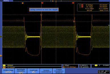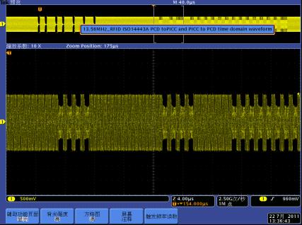 另一個(gè)需要嚴(yán)格保證的時(shí)間是從讀寫器發(fā)出讀卡信號(hào)后到標(biāo)簽返回信號(hào)的時(shí)間。過長(zhǎng)或過短的時(shí)間都會(huì)被認(rèn)作讀寫失敗。使用傳統(tǒng)儀器測(cè)量這些信號(hào)的難度很大。MDO4000可以將RF信號(hào)的AvsT的軌跡完整展示的屏幕中,用戶只需用光標(biāo)定位到相應(yīng)位置,即可得到這一延遲時(shí)間。
