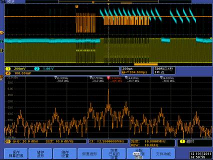 在調(diào)試RFID系統(tǒng)時(shí),工程師面臨的一個(gè)重要的困難是如何測(cè)量標(biāo)簽的返回信號(hào)。由于標(biāo)簽返回信號(hào)的幅度很小,使用普通的示波器往往難以捕獲這一信號(hào),更不要說對(duì)其幅度和頻率做進(jìn)一步分析了。主要原因是普通示波器的動(dòng)態(tài)范圍只有40dB,無法捕獲微弱的標(biāo)簽信號(hào)。MDO4000具有60dB的動(dòng)態(tài)范圍,以及低至-152dB/Hz 的底噪,能夠很好地勝任同時(shí)捕獲讀寫器信號(hào)和標(biāo)簽信號(hào)的任務(wù)。其獨(dú)特的AvsT射頻信號(hào)幅度的時(shí)域波形功能,甚至可以顯示標(biāo)簽信號(hào)幅度變化過程。