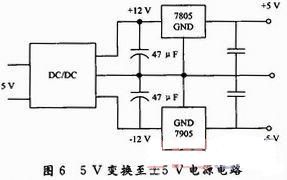 采用DC/DC定電壓隔離非穩壓模塊A0512S-2W,將5 V單電源變換成±12 V,再利用穩壓模塊變換成±5 V電源,給前兩級放大器供電。電路如圖6所示。類似地,用定電壓隔離模塊A0515S-2W,將5 V變換至±15 V電源為末級放大器供電。如圖6所示。