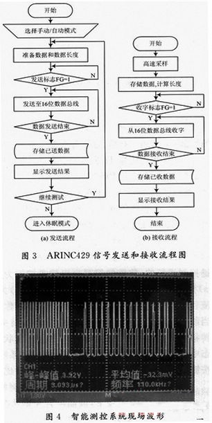 系統(tǒng)工作可分為三種主狀態(tài):準(zhǔn)備接收狀態(tài),正在接收狀態(tài)和準(zhǔn)備發(fā)送狀態(tài)。整個(gè)系統(tǒng)軟件的運(yùn)行圍繞著按鍵控制進(jìn)行的,軟件的編寫(xiě)也以鍵盤(pán)按鍵為基礎(chǔ)。圖3(a)為ARINCA29信號(hào)發(fā)送流程圖,圖3(b)為信號(hào)接收流程圖,橢圓框里寫(xiě)著系統(tǒng)當(dāng)前的狀態(tài)名稱,直線表示當(dāng)前系統(tǒng)所處的狀態(tài),圓形框表示按鍵,箭頭表示狀態(tài)轉(zhuǎn)移走向。每一條直線都表示一種循環(huán)的狀態(tài),在該狀態(tài)中,系統(tǒng)一直等待的按鍵按下,如果有,系統(tǒng)立即掃描按鍵,得出鍵值,并與直線下方的按鍵進(jìn)行比較,如有相同的按鍵,馬上執(zhí)行該按鍵對(duì)應(yīng)的程序。例如在準(zhǔn)備接收狀態(tài),如果背光鍵按下,液晶屏背光則從亮變?yōu)闇缁驈臏缱優(yōu)榱痢nl率鍵按下后,ARINC429總線頻率將在12.5 Kb/s,50 Kb/s和100 Kb/s之間相互轉(zhuǎn)換。存儲(chǔ)鍵按下后,系統(tǒng)將跳到讀寫(xiě)存儲(chǔ)器子狀態(tài);確認(rèn)鍵按下,系統(tǒng)將跳到正在發(fā)送主狀態(tài)。使用類似的方法,為了簡(jiǎn)化使用人員的操作步驟,可以在使用時(shí)選擇手動(dòng)或自動(dòng)模式。自動(dòng)模式提供兩組默認(rèn)的典型數(shù)據(jù)進(jìn)行發(fā)送,以測(cè)試?yán)走_(dá)導(dǎo)航儀的通信完好性。當(dāng)需要進(jìn)行完備性測(cè)試時(shí),可以采用手動(dòng)模式,這時(shí)可以進(jìn)行任何信號(hào)及數(shù)值的通信。